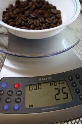 3.) Grind out your coffee, pour it into the heated and cleansed filter (while on the scale) and ZERO (tare) out the scale to zero.