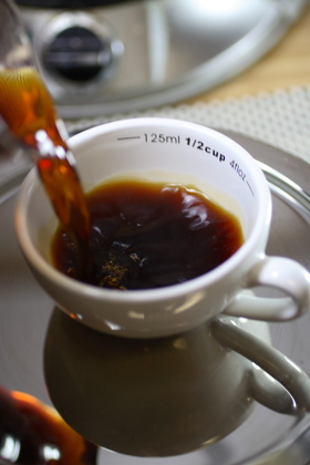 Photo at right: Brewing and tasting... I serve my coffee in heated 4 fluid ounce cups - with coffee poured from a glass or steel thermos. Keeping it hot!